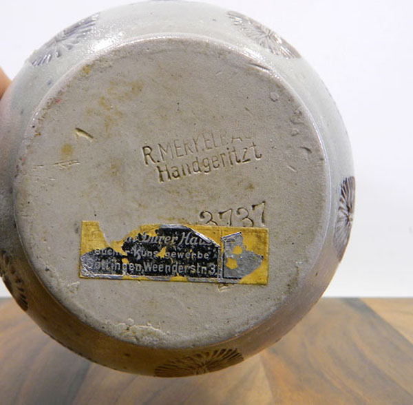 Reinhold Merkelbach, Höhr-Grenzhausen, Westerwald. Unternehmen registriert im Jahr 1845. Eines der wichtigsten Unternehmen zur Herstellung von künstlerischem Westerwälder-Steinzeug. Bekannte Entwerfer waren: Albin Müller, Richard Riemerschmid und Paul Wynand.