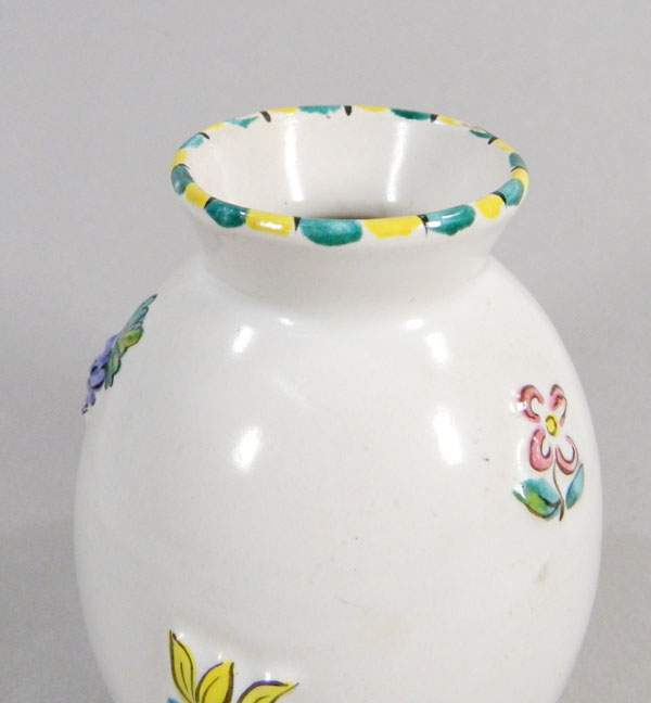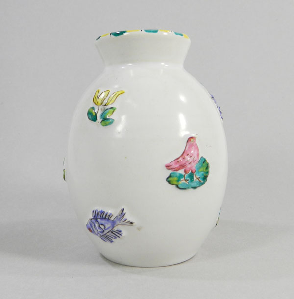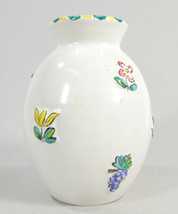 Kleine Vase mit Reliefdekor und Bemalung. Boden mit Marke „S Fisch G“ und Ritznummer 237. Leider konnte ich keine Details zu dem Entwurf finden. Für jeden Hinweis zu der Vase- wie Alter, Entwurf etc. wäre ich sehr dankbar! Hinweise bitte per Email an: kevinbuelow [aet] gmx . de