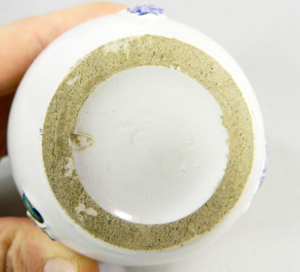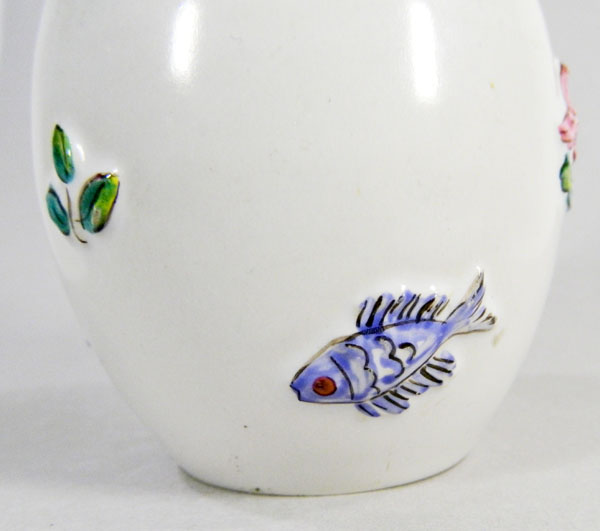 Kleine Vase mit Reliefdekor und Bemalung. Boden mit Marke „S Fisch G“ und Ritznummer 237. Leider konnte ich keine Details zu dem Entwurf finden. Für jeden Hinweis zu der Vase- wie Alter, Entwurf etc. wäre ich sehr dankbar! Hinweise bitte per Email an: kevinbuelow [aet] gmx . de